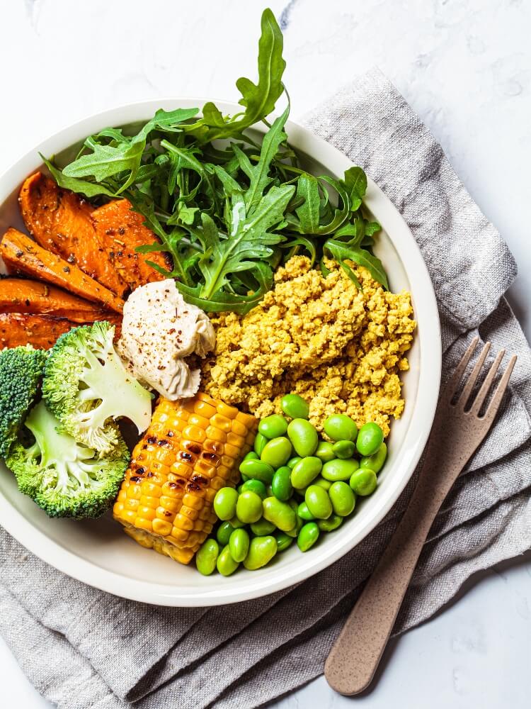 Voor wie wat meer tijd heeft: de breakfast plate met tofu scramble. Deze is wat ingewikkelder, maar in de basis kies je verschillende groentes die je aanvult met vetten en eiwitten. Denk bijvoorbeeld aan avocado, cottage cheese, ei of scrambled tofu. Een recept van de laatste vind je al in mijn ebook!