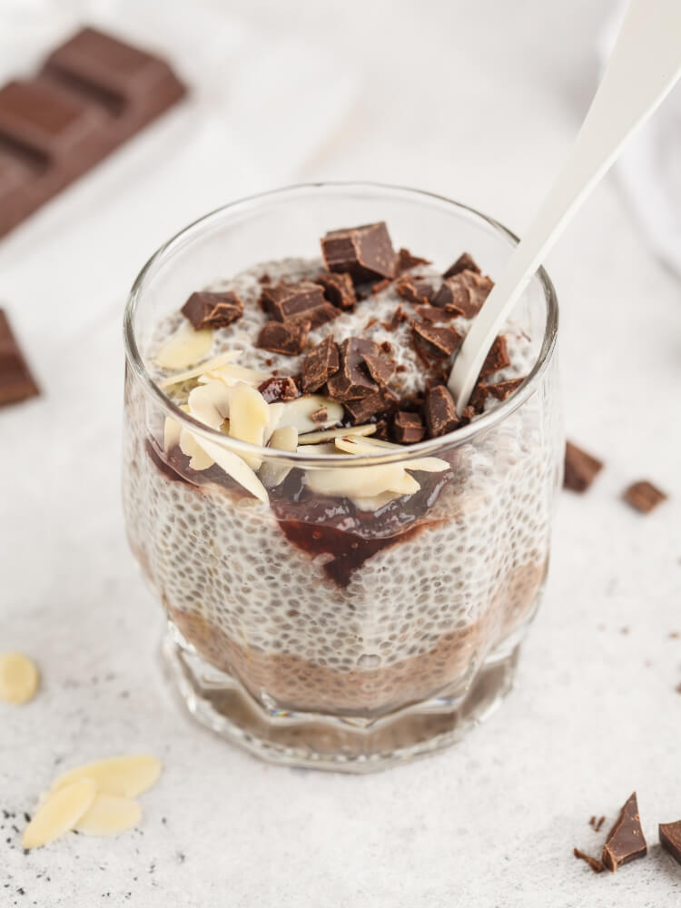 Chia pudding maak je door het overnacht in de koelkast te zetten. Het is zo in de ochtend snel klaar, eiwit-en vetrijk, verzadigend en de zaadjes zijn ook nog eens goed voor je darmen. Combineren met chocola zoals hier op de foto kan ook. Gebruik daarvoor pure cacao poeder, cacao nibs of een beetje 100% donkere chocolade.