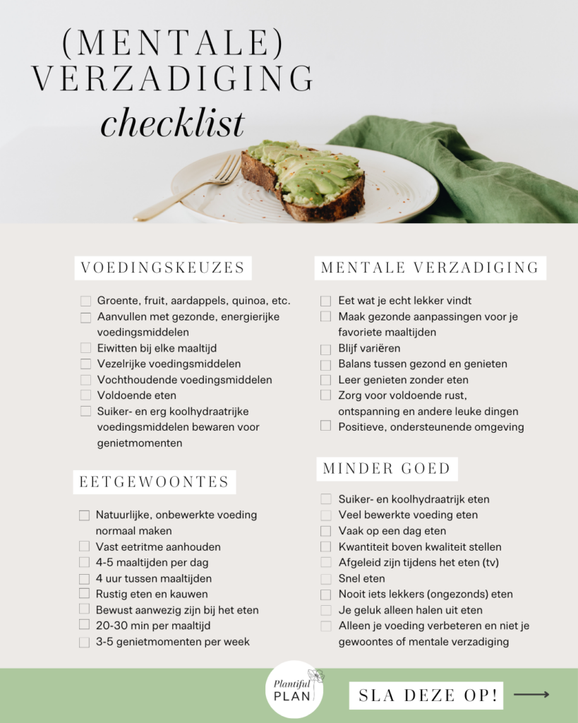 Verzadiging is van meer factoren afhankelijk dan alleen hoeveel je eet. Door ook te letten op vezels, natuurlijke voedingsmiddelen, eiwitrijke maaltijden, goede eetgewoontes en de juiste balans tussen gezonde en ongezondere eetmomenten, bereik je meer verzadiging. Dit kan je helpen doelen te behalen zoals makkelijker afvallen, eetbuien verminderen of je relatie met eten verbeteren. Hoe meer je doet, hoe beter je je zult voelen en hoe beter het zal gaan. Onderstaande checklist kun je gebruiken om bij te houden waar je verbeterpunten liggen.