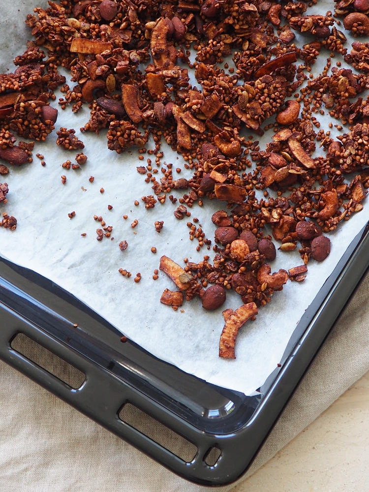4. Spreid de granola uit over het bakblik en zet het voor 45 minuten in de oven. Haal de granola elke 15 minuten uit de oven en schep alles voorzichtig goed om.