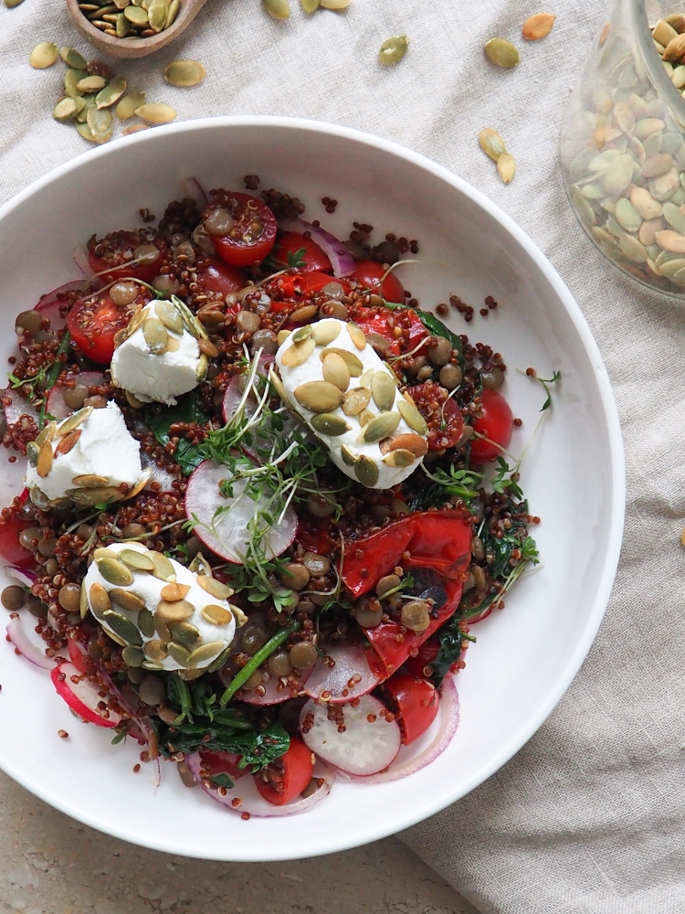 Heb jij je weleens afgevraagd hoe bloggers, diëtisten, koks en foodcoaches hun recepten bedenken? Of hoe ik bijvoorbeeld deze quinoa salade bedacht heb? Ik zal je verklappen hoe ik het doe. Het liefste laat ik me inspireren door wat ik eet als ik buiten de deur eet of door wat ik tegenkom op Pinterest. Verrassende smaakcombinaties of gerechten die er leuk uitzien, sla ik op of fotografeer ik. Thuis probeer ik vervolgens met alle ingrediënten die ik op de foto kan herkennen, een namaak te maken. Recepten volg ik nooit, en zo laat ik me ook niet te veel beïnvloeden door wat anderen doen. Sommige ingrediënten worden vervangen of aangevuld, en zo creëer ik uiteindelijk helemaal mijn hele eigen variant.